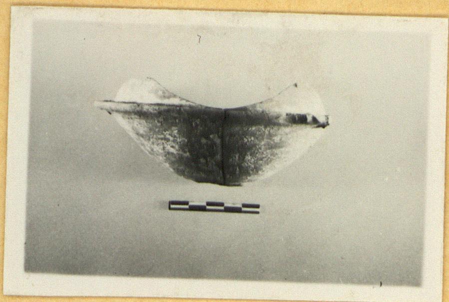 | Description: | Two joining fragments preserve about half of bowl. In-turned rim; projecting flange; traces of stem attachment. Buff clay; ample traces of added white on exterior and a few chance streaks on interior. On top of flange, traces of pink or red on the white. | |