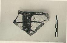 | Description: | From bottom of plate with medium ring foot. Part of body and shoulders of a figure, thrusting a lance(?) the left hand preserved at edge of fragment; body incised, hand sgraffito. Pinkish-buff clay; very light yellow-green glaze; white slip outside. | |
