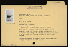 | Description: | Fragment of rim and upper part of wall of Samian A bowl. Broad, shallow bowl with vertical overhanging lip. At top of outer surface of lip, a rounded moulding set off from rest of surface by a groove. On floor, inside, a wheel-run groove. Reddish-cinnamon micaceous clay, firm texture. Orange-red glaze inside and out. | |