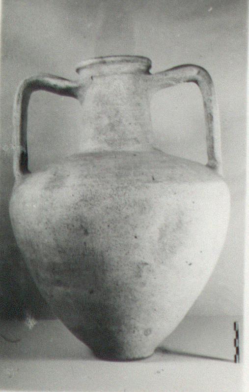 | Description: | Intact, save minor chips. Rather wide mouth and neck; broad shoulder with groove. Squat body tapering sharply to a small flat bottom. Broad grooved handles, from ridge below lip. Gritty buff clay; light buff slip. | |
