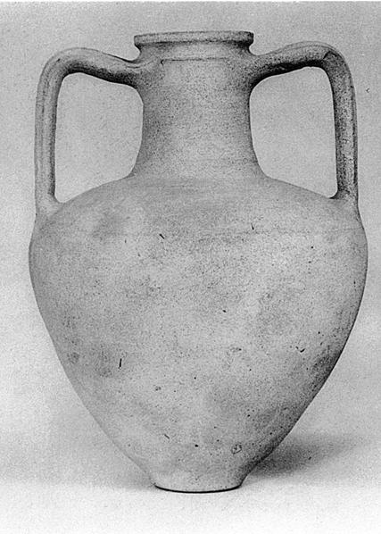 | Description: | Intact, save minor chips. Rather wide mouth and neck; broad shoulder with groove. Squat body tapering sharply to a small flat bottom. Broad grooved handles, from ridge below lip. Gritty buff clay; light buff slip. | |