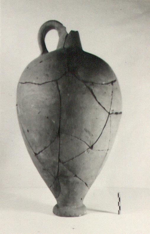 | Description: | Mouth and much of neck missing. Narrow neck. Egg-shaped body tapering down to small flaring foot. Rather thick handle, its outer face concave. Graffito finely incised beneath handle: <graphic> Fabric as P 16205 (ΕΕ 377), the surface better preserved. ADDENDA P 16205: Micaceous reddish-brown clay; unglazed. | |