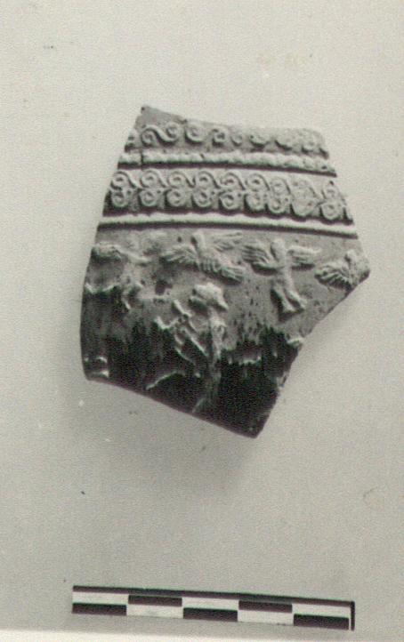 | Description: | A single fragment, broken all around, preserves part of wall. Upper zone: leaves, double spirals, and simplified guilloche between lines, the upper of which is beaded. Main zone: above, a row of flying birds and Erotes, then a centaur, left, playing the lyre. Cf. P 16213. Glaze brown to black, much peeled inside and out. Cf. Agora XXII, no. 130, p. 59. | |