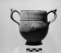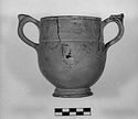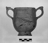 | Description: | Mended from many pieces; one handle and much of foot and body missing; restored in plaster. Straight lip, set off by deep grooves above and below. Profiled foot. Incised on the lip, both sides, a short band of wavy pattern above to straight lines and one wavy. Irregular straight and curving lines across rim beside and beneath handles. Dull, very flaky black glaze. | |