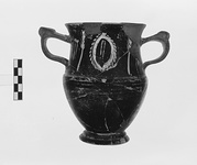 | Description: | Both handles, except stubs, and fragments of lip and body missing; one non-joining fragment. Restored in plaster. Shape as P 16233 (ΕΕ 409), but somewhat lower and the upper wall more sharply concave. West slope decoration in white and yellow on upper half of body: on either side, a wreath between ears of grain; dot rosettes as filling ornaments; pairs of streamers beside handles. Dull black glaze, somewhat worn and flaked. ADDENDA P 16233: A tall kantharos with plain lip. Upper half of body slightly concave, set off from lower, ovoid, body by a broad shallow groove. Profiled foot. Vertical band handles with plastic ivy leaf on top. | |