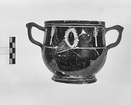 | Description: | One handle and fragments of rim and body missing; restored in plaster. Shape as P 16238 (ΕΕ 414), but the lip less rounded, and with two scraped grooves below it. Ivy leaf on handle. West slope decoration as P 16238 (ΕΕ 414), but without the dot rosettes. ADDENDA P 16238: More or less cylindrical body, narrowing slightly toward top. Profiled ring foot. Plain rim, rounded, a scraped groove below it outside; a second scraped groove at the line of the lower handle attachments. Vertical band handles with plastic masks. West slope decoration on upper part of body, between the two grooves: a wreath between ears of grain, a dot rosette either side of the wreath; pairs of streamers beside the handles. | |