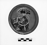 Description:   Two joining fragments preserve about half. Restored in plaster. Ring foot; projecting rim, nearly horizontal, with two scraped grooves. West slope decoration of various kinds on floor: on upper part, bunches of grapes alternating with ears of wheat; dot rosettes between; at center, within a broad scraped groove, small irregular five-petalled rosette.