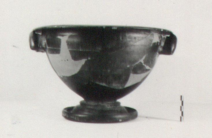 | Description: | Small fragments of rim and body missing; restored in plaster. Out-turned rim, directly below which are two heavy semi-circular lug handles. Body tapers sharply to short thick stem. Wide profiled foot with deep depression in its upper surface. Black glaze all over; fired red at center of floor inside and under foot. | |