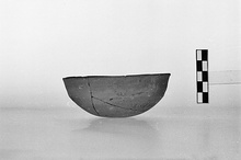 | Description: | Fragments of rim and body missing; restored in plaster. A hemispherical footless bowl with very slightly out-turned rim, the inner surface flat and down-sloping. Dull flaky red glaze on interior; exterior unglazed. | |