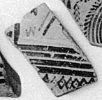 | Description: | Decorated with lozenges and stripes above panel showing warrior with spears(?). Red paint. From large Dipylon amphora of ripe style. | |
