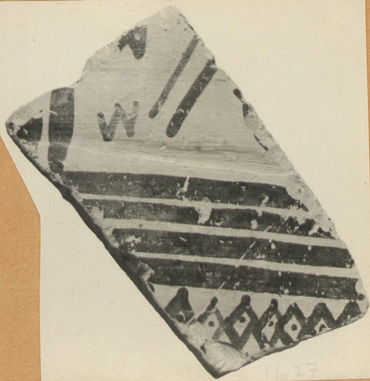 | Description: | Decorated with lozenges and stripes above panel showing warrior with spears(?). Red paint. From large Dipylon amphora of ripe style. | |