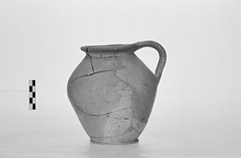 | Description: | Small fragments missing throughout. Shape similar to P 16282 (ΕΕ 458), but body slightly more squat and angular and lip more flaring. Somewhat warped. Unevenly fired, pale buff to pinkish-buff. ADDENDA P 16282: Round mouth sitting practically on body. Deep ovoid body on flat base slightly projecting. Plain band handle from lip. | |