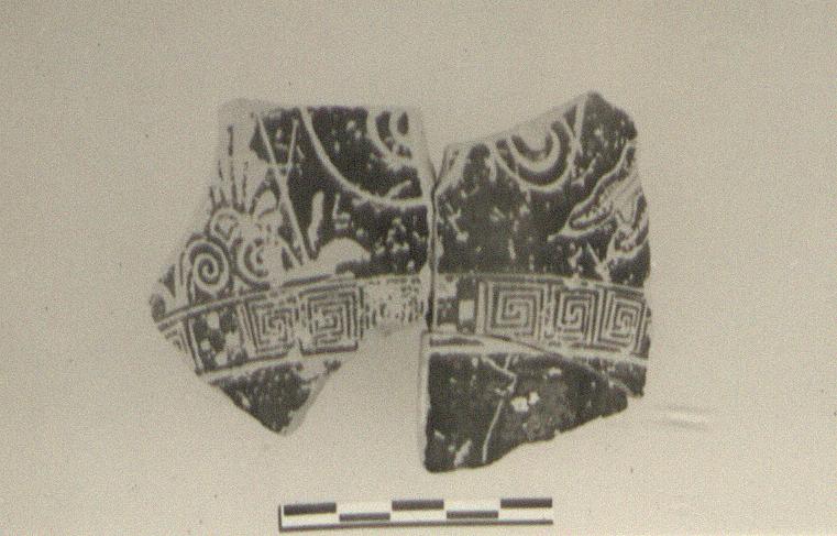 | Description: | Three joining fragments from lower wall, preserving the end of Athena's drapery and part of the handle ornament; maeander and checkerboard below. Thick dull glaze wash inside. For the drapery, cf. P 15840-P 15842; for the palmette, P 15844. | |