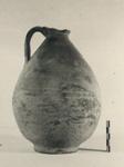 | Description: | Lip broken away; otherwise intact. Deep body on ring foot; no shoulder. Narrow neck with flaring lip; vertical strap handle. Body lightly ribbed in lower part and marked by two grooves just below lower handle attachment. Coarse greenish to greenish-gray clay (same fabric as P 3523) with black bits. Brown to purplish-brown glaze-paint, matte, on exterior; foot and lowest part of body reserved. Surface much worn over all. Condition and colors of clay and glaze possibly due to action of fire. | |