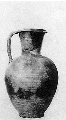 | Description: | Fragments from neck and lip. Rather plump body narrowing at bottom to plain low ring foot. Shoulder and body form continuous curve. High broad neck flaring outwards toward the exterior. Broad strap handle with three vertical grooves from shoulder to lip. Wheel grooves around neck above middle and around shoulder at handle attachment. Soft reddish clay with bits. Dark orange-red glaze-paint, matte, on exterior, not reaching to bottom. | |