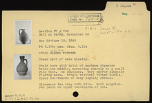 | Description: | Upper part of neck missing. Ovoid body with point of maximum diameter below the middle, narrowing sharply to a small ring foot. No shoulder. Very narrow slightly flaring neck. Single vertical ribbed handle. Upper two-thirds of body lightly ribbed. Micaceous tan clay with bits. Dull purplish-red paint on upper two-thirds of pot. | |