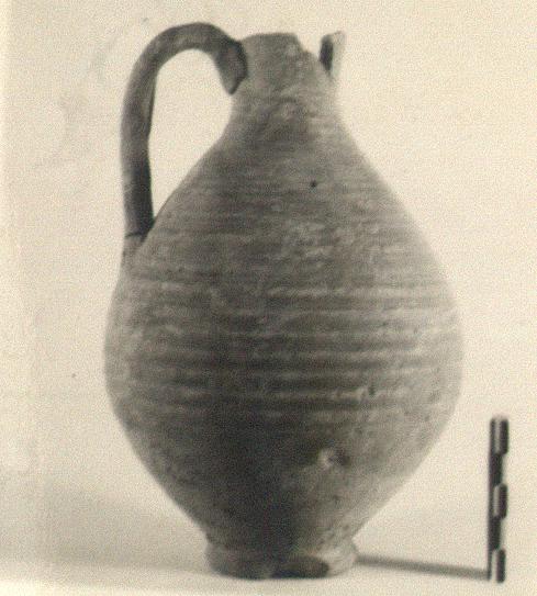 | Description: | Upper part of neck missing. Ovoid body with point of maximum diameter below the middle, narrowing sharply to a small ring foot. No shoulder. Very narrow slightly flaring neck. Single vertical ribbed handle. Upper two-thirds of body lightly ribbed. Micaceous tan clay with bits. Dull purplish-red paint on upper two-thirds of pot. | |