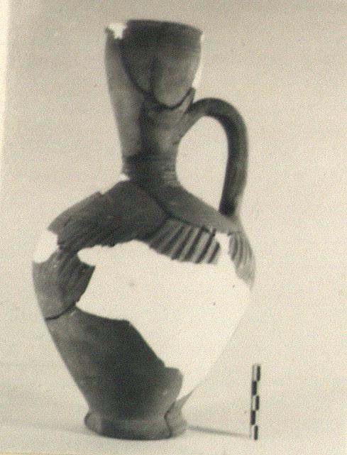 | Description: | Much of body and fragments of lip missing; restored in plaster. Ovoid body with point of maximum diameter above middle; ring foot. No marked shoulder. Tall neck, very narrow at base, bulbous above. Plain everted lip, vertical ribbed band handle, from well down on neck. Light ribbing at top and base of neck and on shoulder. Below lower handle attachment a zone of oblique gouging. Soft slightly micaceous orange clay with bits. | |