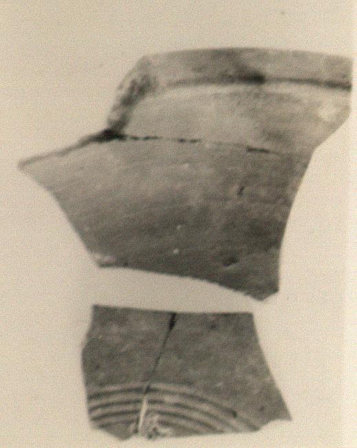 | Description: | a) Preserves small part of floor and rim. b) Non-joining floor fragment. Flat bottom; flaring slightly convex wall, joining bottom at angle. Thickened lip slopes up and in and overhangs to interior. Fragment b) preserves traces of four concentric grooves and of a crude palmette stamp just inside the grooves. Late Roman D. | |