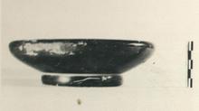 | Description: | About half of wall and rim missing. Wide low bowl with nearly flat floor and unthickened incurved lip. Broad ring foot. On floor, stamped palmettes and three circles of rouletting. Scraped groove at juncture of body and foot and another on resting surface. Good black glaze, somewhat worn. | |