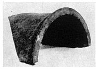 | Description: | Two joining fragments preserve the open end; original surfaces remain at end and on both sides. A plain half-round shell of clay with a moulded lip at the open end. Pierced with two suspension holes near lip. The nature of the original surfaces along the bottom on both sides and the fact that the interior shows marks of wheel-turning indicate that this epinetron is only half of a tube of clay that was partly cut through (as in the case of well-tiles) vertically before baking. The closed end was probaby flat rather than rounded, as in the red figured epinetra? Coarse red clay; thin matte red wash on exterior. | |