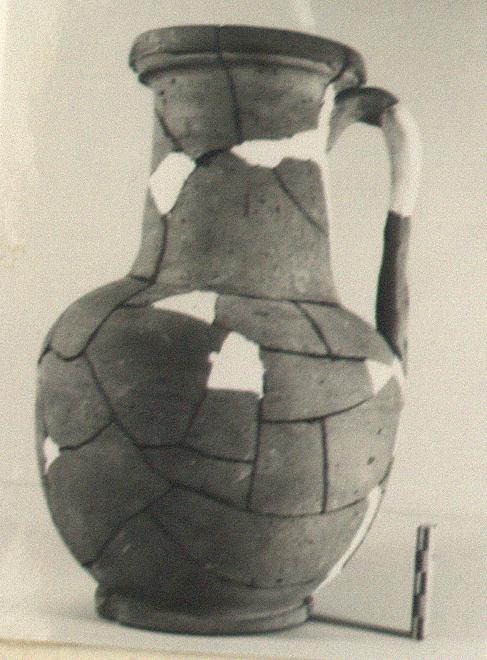 | Description: | Mended from many pieces; fragments missing from body, neck and handle; restored in plaster. Squat body, narrowing slightly near bottom to a plain low ring foot. Shoulder narrow and rounded. Neck wide and high, joining shoulder at an angle. Flaring lip, thickened and grooved on underside. Vertical strap handle from shoulder to just below lip. Soft micaceous buff clay, the surface much worn over all. Cf. Agora XXXIII, no. 45. | |
