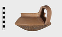 | Description: | About half of upper body and much of the strainer-bottom missing; restored in plaster. The bottom, pierced with a great many small holes, is shaped like an inverted broad low cone, but it was probably rounded rather than pointed at the center, which is missing. The upper part of the pot, with solid walls, joins the bottom at a sharp angle. The upper part is low, and at the top curves outward to form a plain lip. Vertical strap handle from the angular juncture of top and bottom parts to lip; the handle arches well above the lip. Rather coarse reddish clay with bits; cooking pot fabric. The under-surface of the strainer is blackened, as though by (slight) contact with fire. | |