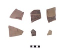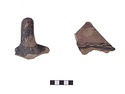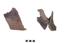 | Description: | Sixteen fragments, some consisting of several joined pieces, of a basin similar to P 3310 (Γ 374). The pot is not sufficiently whole to deserve restoration at present: a) part of base of wall, b) spout, c) handle, d) wall with pie-crust decoration. The preserved fragments give part of handle and of base, part of wall, and the spout almost complete. Rim missing. From a flat-bottomed basin with almost vertical walls and a large spout with flaring lip, springing from wall below rim. Horizontal handles, round in section. A raised ridge with pie-crust indentations around the wall below the rim. Pinkish-buff clay; thin dull glaze varying from black to purplish-brown on interior and on upper part of exterior. | |