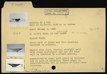| Description: | About half of plate and foot missing; restored in plaster. Narrow ring foot, flaring straight wall with plain horizontal lip set off from wall on interior by a slight groove. Reddish-brown clay; dull glaze on interior and on part of exterior, fired black to purplish-brown; red at center of floor from stacking. | |