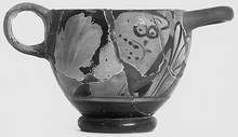 | Description: | Part of rim and wall, including the horizontal handle, missing. On either side, owl with head facing, between two olive sprays. Glaze fired red to black, badly worn and peeled on the outside. The space inside the heavy ring foot reserved, with a small glazed circle and dot at the center. | |