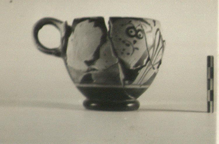 | Description: | Part of rim and wall, including the horizontal handle, missing. On either side, owl with head facing, between two olive sprays. Glaze fired red to black, badly worn and peeled on the outside. The space inside the heavy ring foot reserved, with a small glazed circle and dot at the center. | |