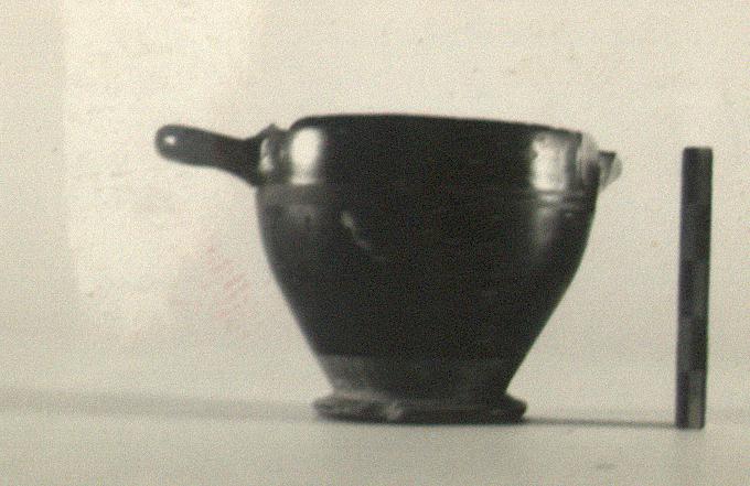 | Description: | Small pieces of rim and wall, and most of one handle missing. Shape similar to P 16473 and P 16374 (ΓΓ 928 and Γ 929), but rather more substantial and less eggy. System of glazing and decoration the same; a single brown circle and dot at the center below. ADDENDA P 16474: The shape much as P 16473 (ΓΓ 928) but the walls rather sharper and more flaring, and the lip a little more drawn in. Reserved areas and decoration the same, but the circles on the underside much thinner, brown. P 16473: Flaring ring foot; lip slightly drawn in. Reserved and reddened: inner edge of rim; insides of handles and handle spaces; base of wall and upper edge of foot, with fine parallel lines around base of wall; space inside foot, with central dot and two heavy circles. Two purple lines around the upper wall just below the handle attachments. | |