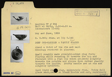 | Description: | About one-third of the rim and wall missing; restored in plaster. Small roughly made straight-sided ring foot; flaring walls rounding in towards the top and finished with a flat lip which projects slightly towards the outside and slopes down rather sharply towards the inside. Stubby handle set at rim and slightly up-tilted. Hard light red clay, moderately fine. Thick dull glaze wash, red to black inside and out, carelessly applied outside so that it does not reach to the foot evenly all around. A coarse version of the conventional one-handler; cf. P 16480 ff. | |
