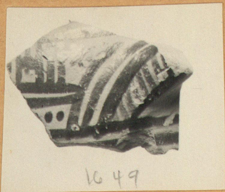 | Description: | Handle fragment from a belly-handled closed pot, probably a hydria [originally identified as kylix]. Decorated with dots, stripes and star; on shoulder, broad and narrow bands. Simple style. Cf. P 586. ADDENDA Three joining fragments added from Box 144 (44-46/ΙΣΤ-ΙΘ, floor) [July 1957]. | |