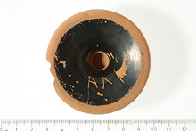 | Description: | Kylix base and part of center of floor. Short stem; foot plain on top, sloping to torus edge; underside rises in a hollow cone. Good black glaze, much peeled, on stem and top of foot. Edge, resting surface, and top of cone reserved. Incised underneath: Α Λ Α | |