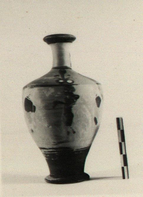 | Description: | Intact. Surface much worn and peeled. Shoulder lekythos with low foot and flaring mouth. Foot and lower body glazed; purple ground line. On body, crude nude figure, left, draped figure facing center to each side. On shoulder, palmette with dotted white eyes center, leaf to each side. Glaze band at base of neck; on this band, and on upper edge of lip, traces of purple. Thick glaze wash on body; traces of burning(?). | |