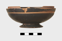 | Description: | Intact, save for chip from rim. High flaring ring foot and rounded body; reserved groove outside below rim; upstanding inner rim to hold lid. Black glaze all over except: bottom of bowl inside foot, resting surface of foot, groove below rim, and upper surface of rim and outer face of inner rim, both the latter painted purple. Double band of purple around center of floor; another pair of purple bands halfway to rim inside. | |