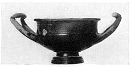 Description:   About half the rim and one handle missing. Restored in plaster. Moulded ring foot; short stem. Body shallow; rim almost vertical with sharply out-curved lip. On floor, four carelessly impressed rosettes surrounded by two lines of rouletting. High-swung cup handles, squared at their ends.