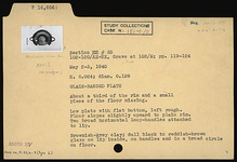 Description:   About one-third of the rim and a small piece of the floor missing. Low plate with flat bottom, left rough. Floor slopes slightly upward to plain rim. Two broad horizontal loop handles attached to lip.