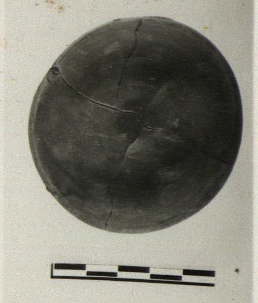 ADDENDA P 16608: Flat bottom, left rough; very low flaring wall, plain lip. Grayish-brown clay; thin wash of black glaze-paint; lustreless.