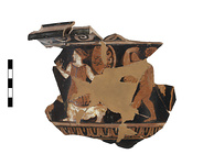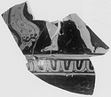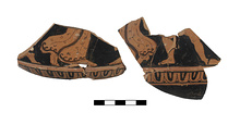 Description:   Parts of the walls and rim preserved, making up to six fragments. Nothing remains of the base. Flaring lower wall, forming an angle with the slightly concave upper wall; projecting rim, its vertical outer face in two degrees, the upper projecting above the rim, the lower overhanging. Wavy pattern on underside of rim; egg and dot around upper part of lower wall. The scene, dancing youths and girls, probably satyrs and maenads, seems to run right around the pot; what remains is more than enough for one side. There are no traces of handles.