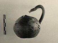 | Description: | Fragmentary; neck and most of mouth missing and much of body. Flat bottom and rounded body; rising vertical band handle, grooved on outer face. Double groove around shoulder below junction with neck. Gray clay; black glaze, much worn. | |