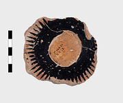 | Description: | Fragment of a lid, broken all around, and the knob at the center broken off. Around the knob, black glaze, then rays; black glaze beneath. Incised on underside: <graphic> | |