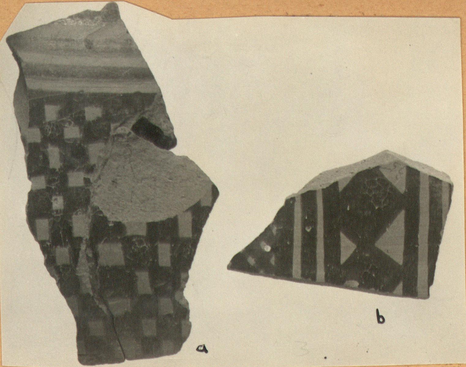 | Description: | Two fragments. Decorated with checkerboard and vertical bands of solid diamonds and lattice pattern. Glazed inside. Ripe Dipylon style. | |