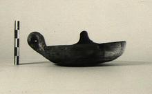 | Description: | Both broken; lid complete, small piece missing from bottom of casserole. Small round-bottomed casserole with vertical lip and interior flange to support lid; single vertical loop handle, on rim. Plain lid with small pointed knob. Coarse brown micaceous clay. Interior of casserole and part of lid blackened by fire. | |