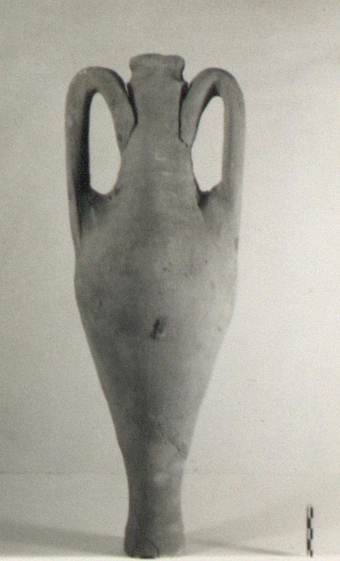 | Description: | Intact, save minor chips. Tall high-swung handles. Small body. Heavy pointed foot, hollow beneath, with projection. Roughly profiled mouth. Brick-red clay; unglazed. | |