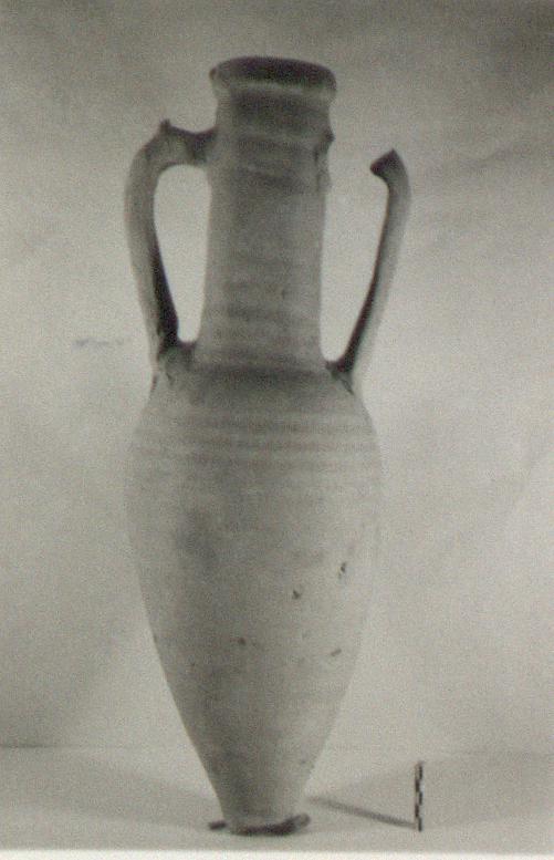 | Description: | Toe and part of one handle missing. Tall cylindrical neck. Small spur on top of handle. Long oval body tapering to pointed toe. Thickened lip. Body roughly ridged. Black dipinto on shoulder: <graphic> Pinkish-buff clay, buff at surface. | |