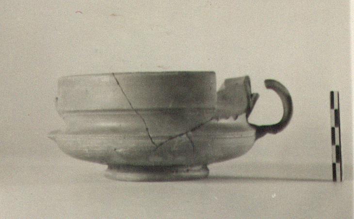 | Description: | One handle and fragments of rim, body and foot missing. One non-joining fragment of rim. Two vertical handles, grooved. Straight rim, below which a concavity; slightly sloping floor. Ring foot. Red glaze inside and out. | |