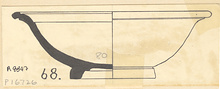 | Description: | Three joining fragments of a small open Pergamene bowl with ring foot. Rim out-turned; marked off inside and out by a groove. Pale yellowish-buff clay; dull light red glaze inside and out. | |