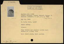 | Description: | Intact. Flat bottom and shallow covnex wall ending in a plain rim. Dull black glaze, much peeled. | |